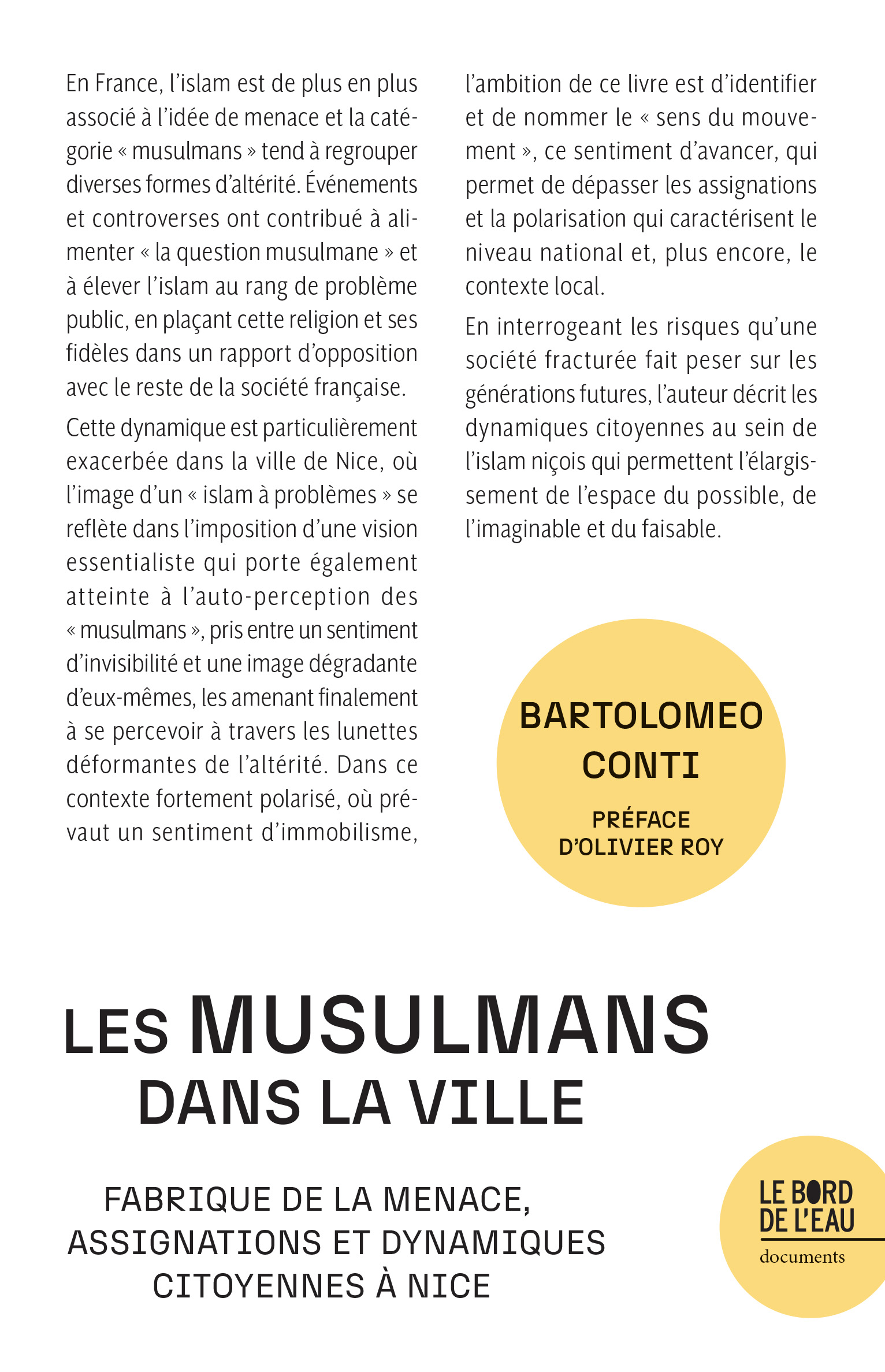 Cette dynamique est particulièrement exacerbée dans la ville de Nice, où l’image d’un « islam à problèmes » se reflète dans l’imposition d’une vision essentialiste qui porte également atteinte à l’auto-perception des « musulmans », pris entre un sentiment d’invisibilité et une image dégradante d’eux-mêmes, les amenant finalement à se percevoir à travers les lunettes déformantes de l’altérité. Dans ce contexte fortement polarisé, où prévaut un sentiment d’immobilisme, l’ambition de ce livre est d’identifier et de nommer le « sens du mouvement », ce sentiment d’avancer, qui permet de dépasser les assignations et la polarisation qui caractérisent le niveau national et, plus encore, le contexte local.