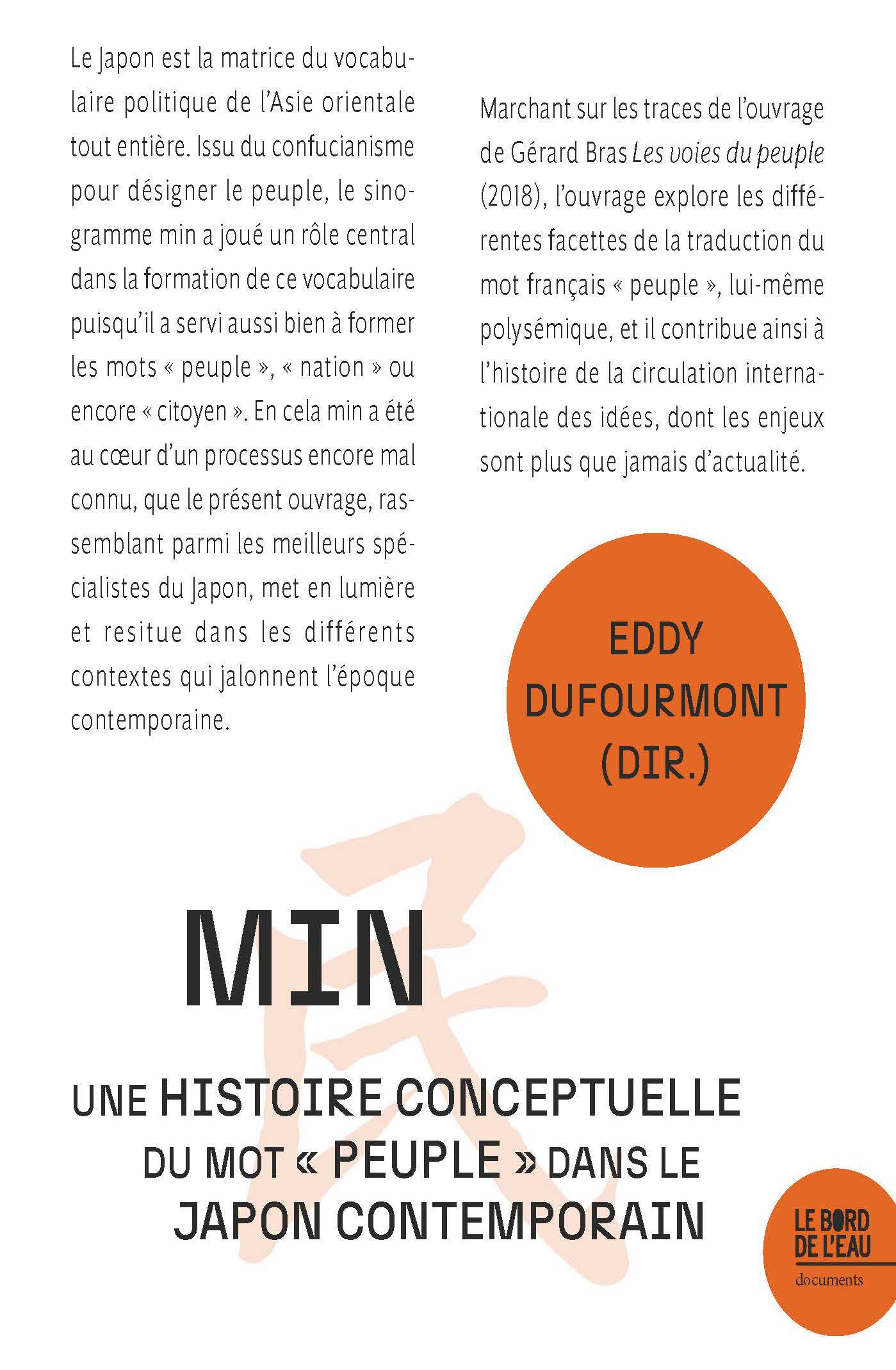 Le Japon est la matrice du vocabulaire politique de l’Asie orientale tout entière. Issu du confucianisme pour désigner le peuple, le sinogramme min a joué un rôle central dans la formation de ce vocabulaire puisqu’il a servi aussi bien à former les mots « peuple », « nation » ou encore « citoyen ». En cela min a été au cœur d’un processus encore mal connu, que le présent ouvrage, rassemblant parmi les meilleurs spécialistes du Japon, met en lumière et resitue dans les différents contextes qui jalonnent l’époque contemporaine. Marchant sur les traces de l’ouvrage de Gérard Bras Les voies du peuple (2018), l’ouvrage explore les différentes facettes de la traduction du mot français « peuple », lui-même polysémique, et il contribue ainsi à l’histoire de la circulation internationale des idées, dont les enjeux sont plus que jamais d’actualité.