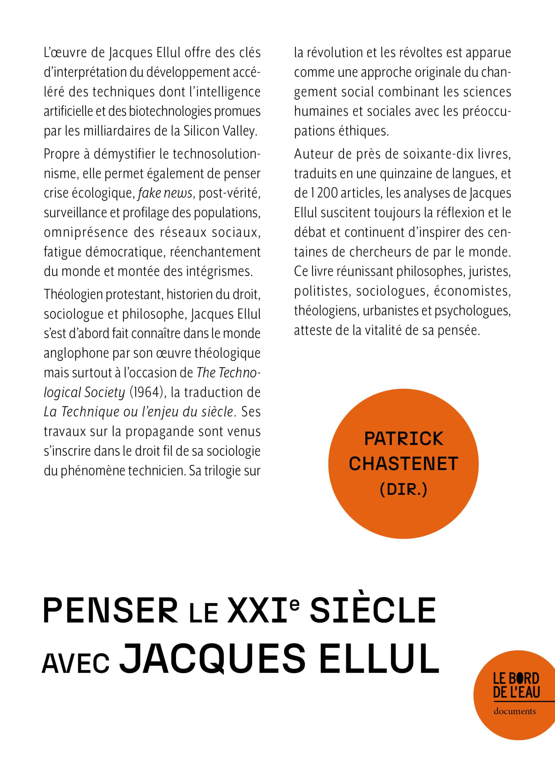 Ouvrage publié sous la direction de Patrick Chastenet, professeur émérite en science politique à l’université de Bordeaux, ancien élève de Jacques Ellul, est l’un des meilleurs spécialistes de son œuvre. Président fondateur de l’Association internationale Jacques-Ellul et de l’International Jacques Ellul Society, directeur des Cahiers Jacques-Ellul et secrétaire général du prix Jacques-Ellul, il lui a consacré de nombreux travaux qui font autorité en France et aux États-Unis. Il a notamment publié Introduction à Jacques Ellul (La Découverte, 2019), Les Racines libertaires de l’écologie politique (L’Échappée, 2023), À contre-courant. Entretiens avec Jacques Ellul (La Table ronde, 2023). Il est l’éditeur du volume Jacques Ellul, Entre technique et liberté (Bouquins/Mollat, 2026).